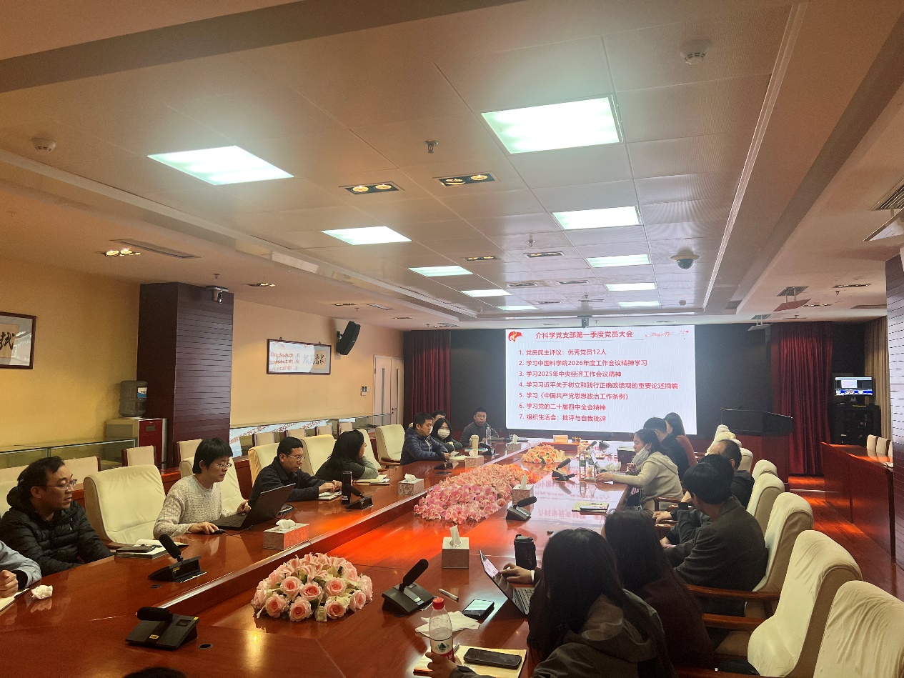 党支部书记王利民首先带领大家学习了中国科学院院长、党组书记侯建国在中国科学院2026年度工作会议上所作的报告《勇担国家战略科技力量主力军使命重任,奋进科技强国新征程》。重点解读了“十四五”时期我院取得的显著成效、当前科技强国建设面临的新形势新任务以及2026年重点部署。王利民强调,作为国家战略科技力量的主力军,我们要将院工作会议精神融入我们的日常科研与管理中,聚焦主责主业,抢占科技制高点,为实现高水平科技自立自强贡献力量。与会党员围绕报告内容展开讨论,一致认为要进一步提升组织力,从深化科研布局、强化协同攻关等方面下功夫,将学习成果转化为推动研究所发展的实际成效。