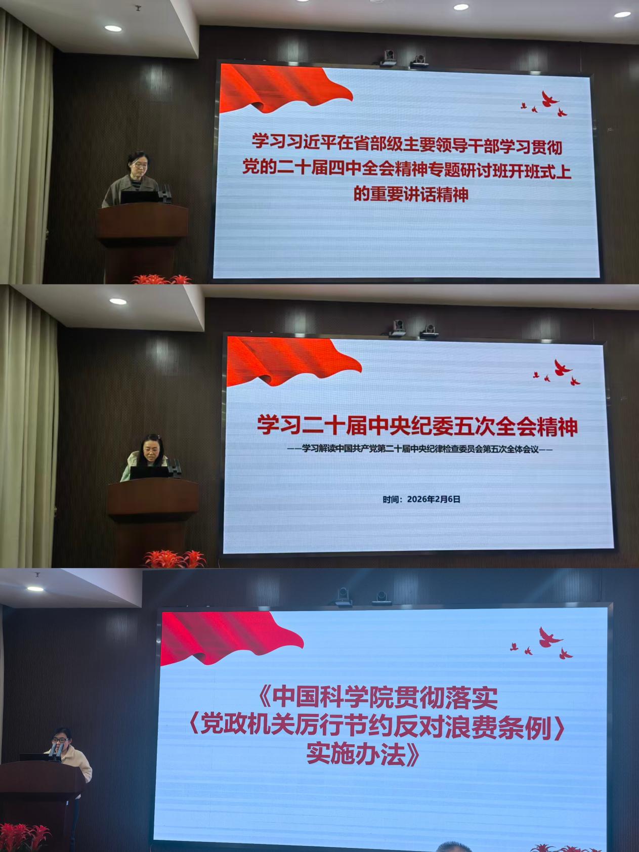 支部委员领学环节,委员依次带领全体党员学习习近平总书记在省部级主要领导干部学习贯彻党的二十届四中全会精神专题研讨班开班式上的重要讲话精神、二十届中央纪委五次全会精神,并对《中国科学院贯彻落实 <党政机关厉行节约反对浪费条例> 实施办法》进行详细解读。通过系列内容学习,进一步强化了党员的政治意识、纪律规矩意识和勤俭节约的作风,引导党员以严的标准、实的作风做好各项科研工作。