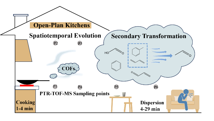烹饪油烟(cooking oil fumes, COFs)作为居住环境中的重要污染源之一,其时空演化及转化过程是环境科学中的一个关键问题。过程工程所陈运法研究员团队与方太集团共同搭建了“烹饪环境与空气治理联合实验室”,通过亚秒级时间分辨质子转移反应飞行时间质谱(PTR-TOF-MS)实时在线监测油烟排放过程中污染物,揭示了油烟污染物在空间中的迁移衰减规律、远处暴露及二次生成动态演变过程,同时研究评估了自然通风(开窗)对污染物削减的影响。近日,相关工作发表在Environmental Science & Technology(DOI:10.1021/acs.est.5c10491)。