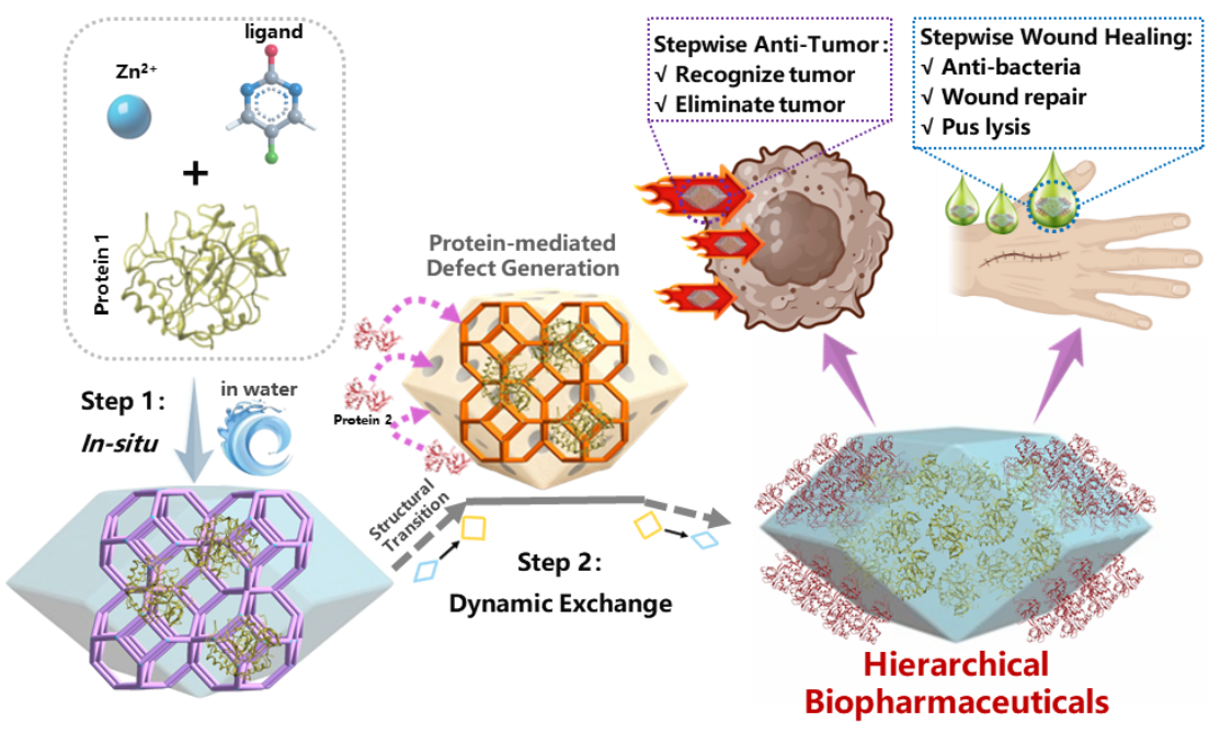 为此,研究团队提出将ZPF的晶态材料作为“智能载体”,通过“原位封装”与“动态配体交换”相结合的策略,为不同成分安排了特定的“座位”,实现区域化精准定位。基于此平台,团队成功开发出高效抗癌制剂与抗菌制剂,分别提升了肿瘤治疗效果与细菌感染伤口的愈合效率。这一研究为多组分生物大分子的层级化固定建立了新范式,开创了生物药的创新平台。研究团队先将抗癌蛋白封装进载体内部,再通过动态交换在载体表面负载靶向蛋白,构建了基于ZPF的多组分抗肿瘤协同制剂系统。实验结果显示,该系统能够精准识别小鼠模型中的肿瘤细胞,随后在肿瘤酸性微环境中快速释放抗癌蛋白,显著增强对小鼠肿瘤细胞的杀伤性。此外,研究人员还发现通过优化蛋白比例及结合小分子抗癌药物,可进一步增强抗肿瘤效果,显示出多组分协同策略在肿瘤治疗中的通用性。