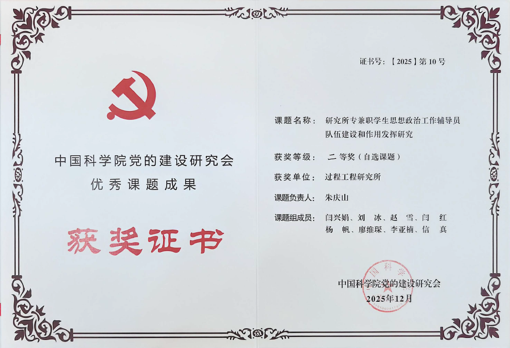 12月3日至5日,中国科学院党的建设研究会2025年课题成果交流评选会在兰州召开,全国党建研究会常务理事、院党建研究会会长李和风出席会议并作总结讲话。会议评选出2025年优秀课题成果,过程工程所承担的课题《研究所专兼职学生思想政治工作辅导员队伍建设和作用发挥研究》获自选课题类二等奖。