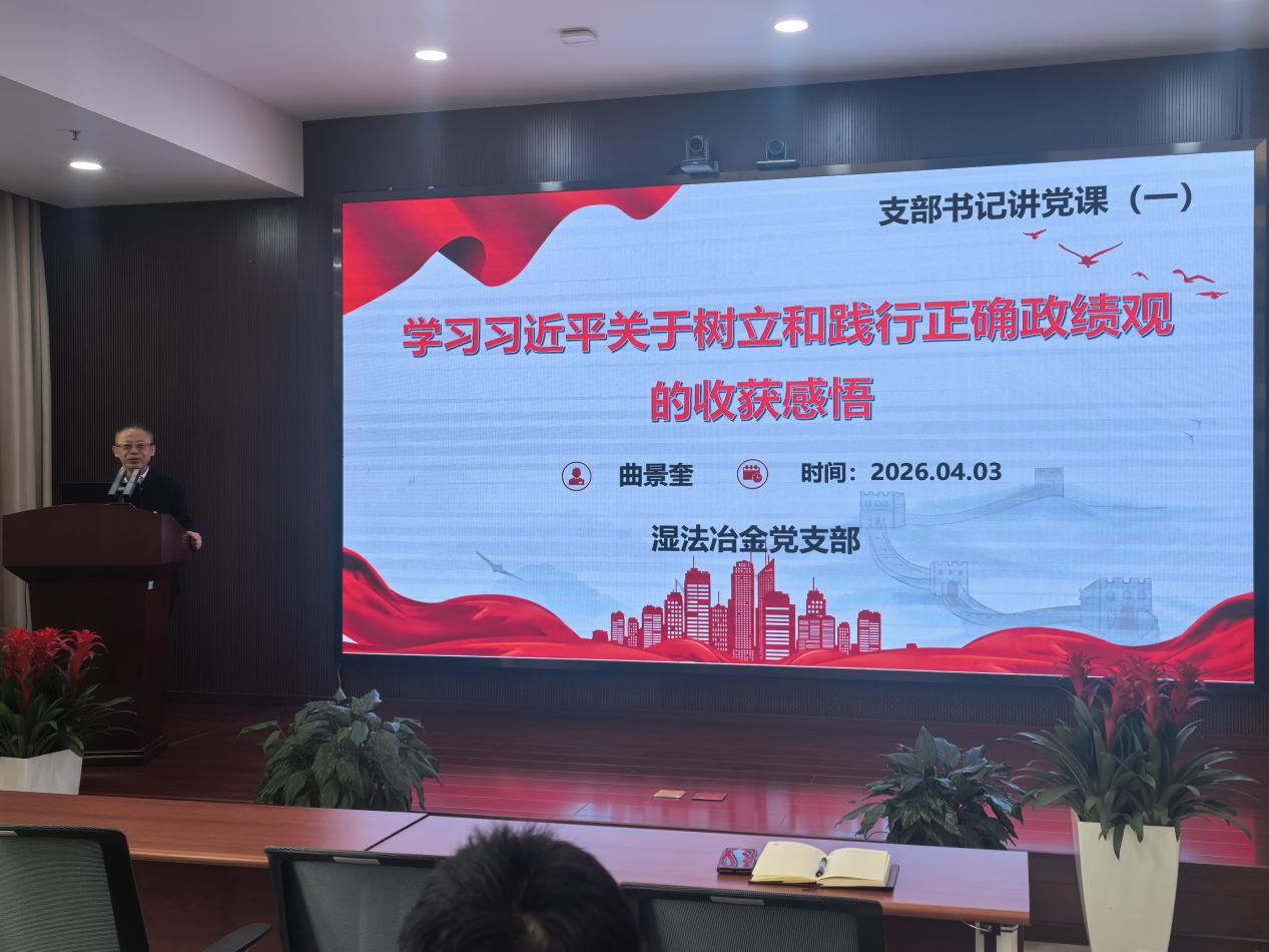 会议伊始,曲景奎讲《学习习近平关于树立和践行正确政绩观的收获感悟》党课,带领全体党员深入学习习近平关于树立和践行正确政绩观的重要论述。曲景奎立足科研人员身份,围绕 “科研工作者该树立怎样的政绩观” 与党员同志交流思考。他指出,科研人员的政绩观,归根结底是要摒弃浮躁功利之心,我们要立足湿法冶金领域的国家战略需求,以“十年磨一剑”的定力潜心科研,把论文写在祖国大地上,以实打实的技术突破、科研成果作为衡量工作成效的标准,将个人科研追求融入国家发展大局,用科技成果服务产业升级、助力国家资源循环利用和绿色发展,这是科研工作者践行正确政绩观的核心要义。