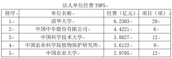 值得关注的是,上述1078个项目由557家法人单位牵头承担,包括112所高等院校、225家科研院所和220家公司企业。其中高校承担了395个项目,同比降低1.8%。与去年相比,虽然在承担项目上有所减少,但是在获批经费上同比增加4.8%,达76.7亿元。以变化较大的农业科技领域为例,农业科技在高校的经费和项目投放上则增加了约15%。