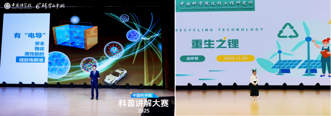 过程工程所的2位选手围绕过程工程主责主业,选题前沿,内容严谨,展现了扎实的科学素养、广阔的科学视野、创新的表达方式,以及沉稳的现场把控。钟声聚焦离子液体,生动地介绍了这种“可设计”的绿色介质的优异特性,以及在过程工业中的广泛应用。徐梦帆则以一段充满想象力的锂离子“回游之旅”,带领公众走进废旧锂电池的绿色回收世界。