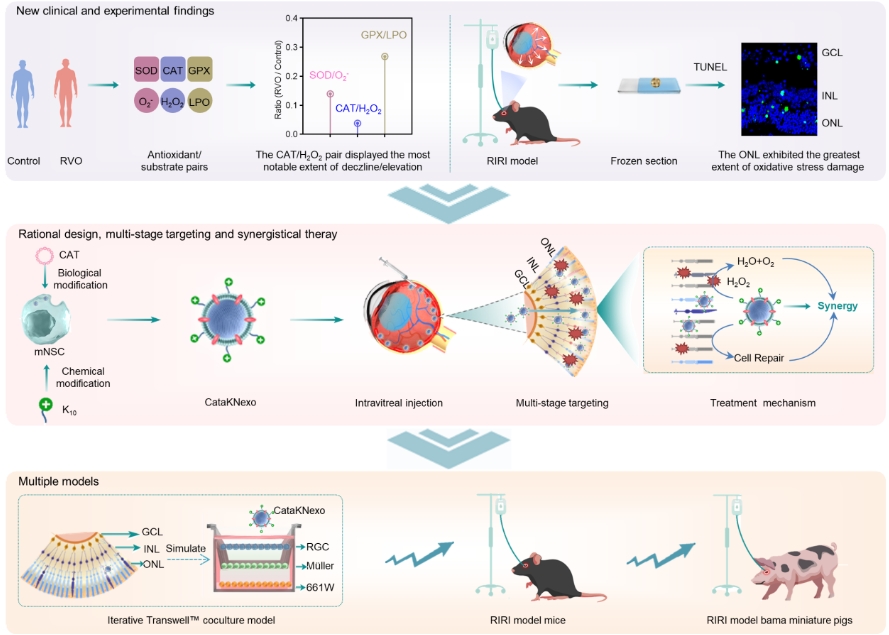 针对上述挑战,生物药制备与递送全国重点实验室主任魏炜,中国科学院院士、过程工程所研究员马光辉与北京朝阳医院眼科主任陶勇教授团队展开深入合作,基于临床发现,提出了工程化外泌体治疗RIRI的新策略。通过对大量RIRI患者的玻璃体液样本研究,团队发现这些样本的过氧化氢水平大幅升高且过氧化氢酶活性明显降低,二者失衡程度显著高于其他氧化应激指标,为团队提供了抗氧化应激损伤的靶标。在小鼠模型中,团队进一步验证了上述发现,并观察到视网膜外核层是氧化应激损伤最严重的区域。在此基础上,团队创新设计了聚赖氨酸(K10)修饰和过氧化氢酶表达的神经干细胞外泌体(CataKNexo)。经玻璃体腔注射后,CataKNexo能够富集到视网膜节细胞层,随后借助K10的渗透作用有效到达外核层,利用过氧化氢酶的抗氧化功能和神经干细胞外泌体的神经保护作用,实现协同治疗。