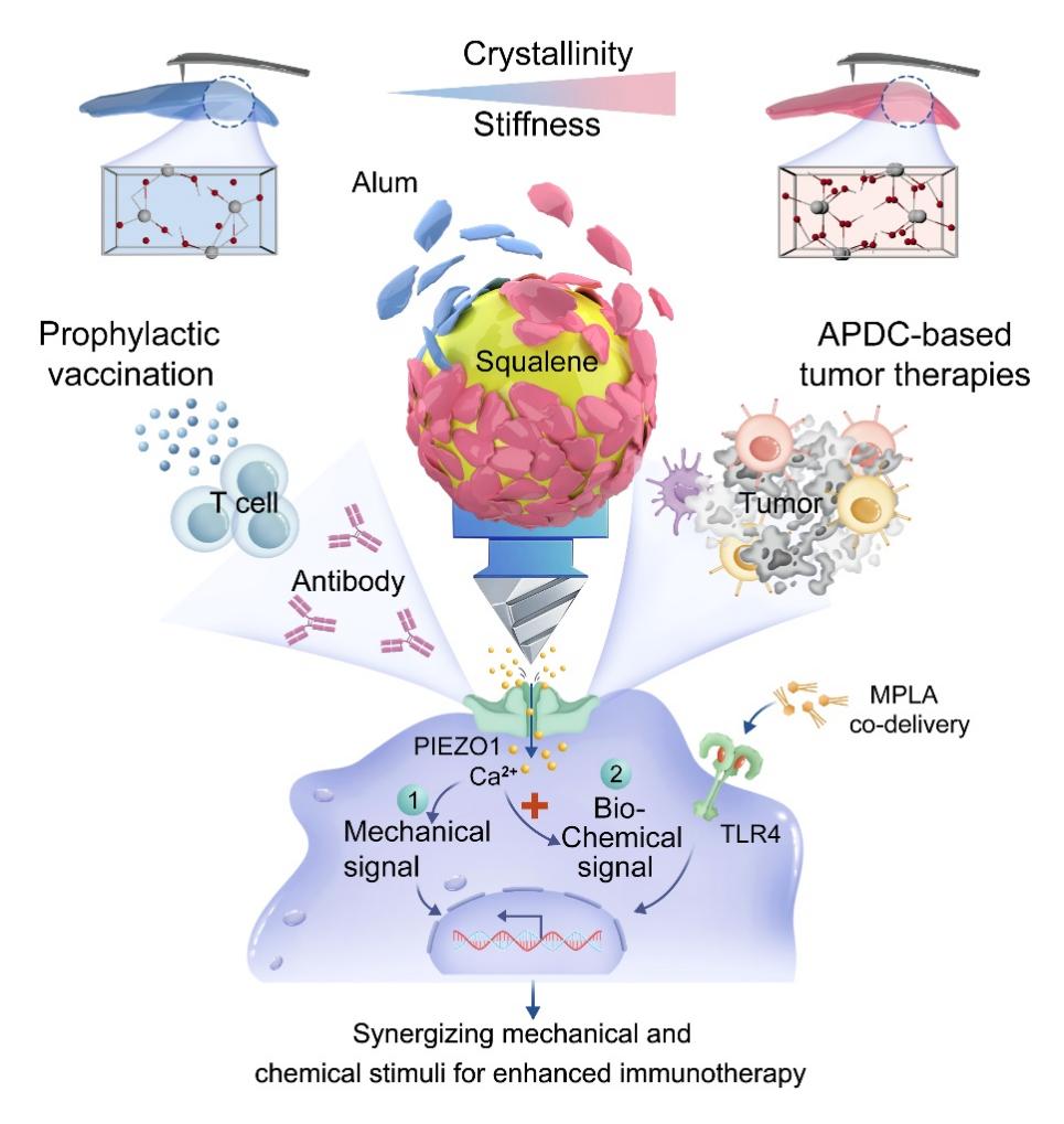 在疫苗与免疫治疗飞速发展的今天,人们往往将注意力集中于分子配方、递送系统或新型免疫刺激剂的设计。铝盐、脂质体、MF59等目前临床常用的佐剂,在细胞膜表面的接触面积有限,难以在三维界面上触发机械感受器,然而PIEZO1离子通道等许多模式识别受体对力学变化高度敏感,传统佐剂几乎无法有效调动这些通路,导致免疫激活存在“天花板效应”。