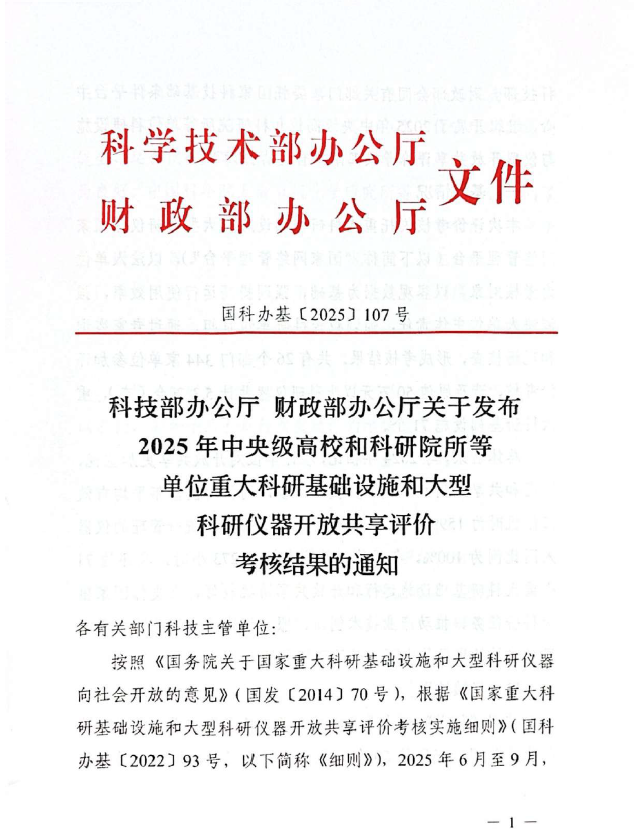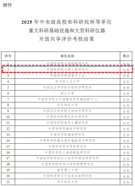 2025年10月10日,科技部办公厅、财政部办公厅联合发布《2025年中央级高校和科研院所等单位重大科研基础设施和大型科研仪器开放共享评价考核结果的通知》,过程工程所再次获评“优秀”,总排名列全国第2。