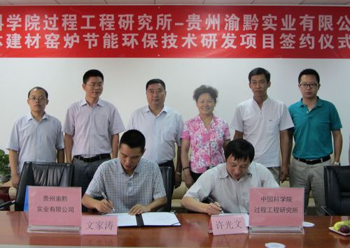 7月24日,贵州渝黔实业有限公司和中科院过程工程所签订合作协议,共同推进型体建材窑炉节能环保技术产业化。贵州渝黔实业有限公司董事长牟建兴、过程工程所党委副书记江明见证了签约仪式,公司总经理文家涛、研究所煤炭分级高效综合利用创新团队首席专家许光文研究员分别代表双方签约。