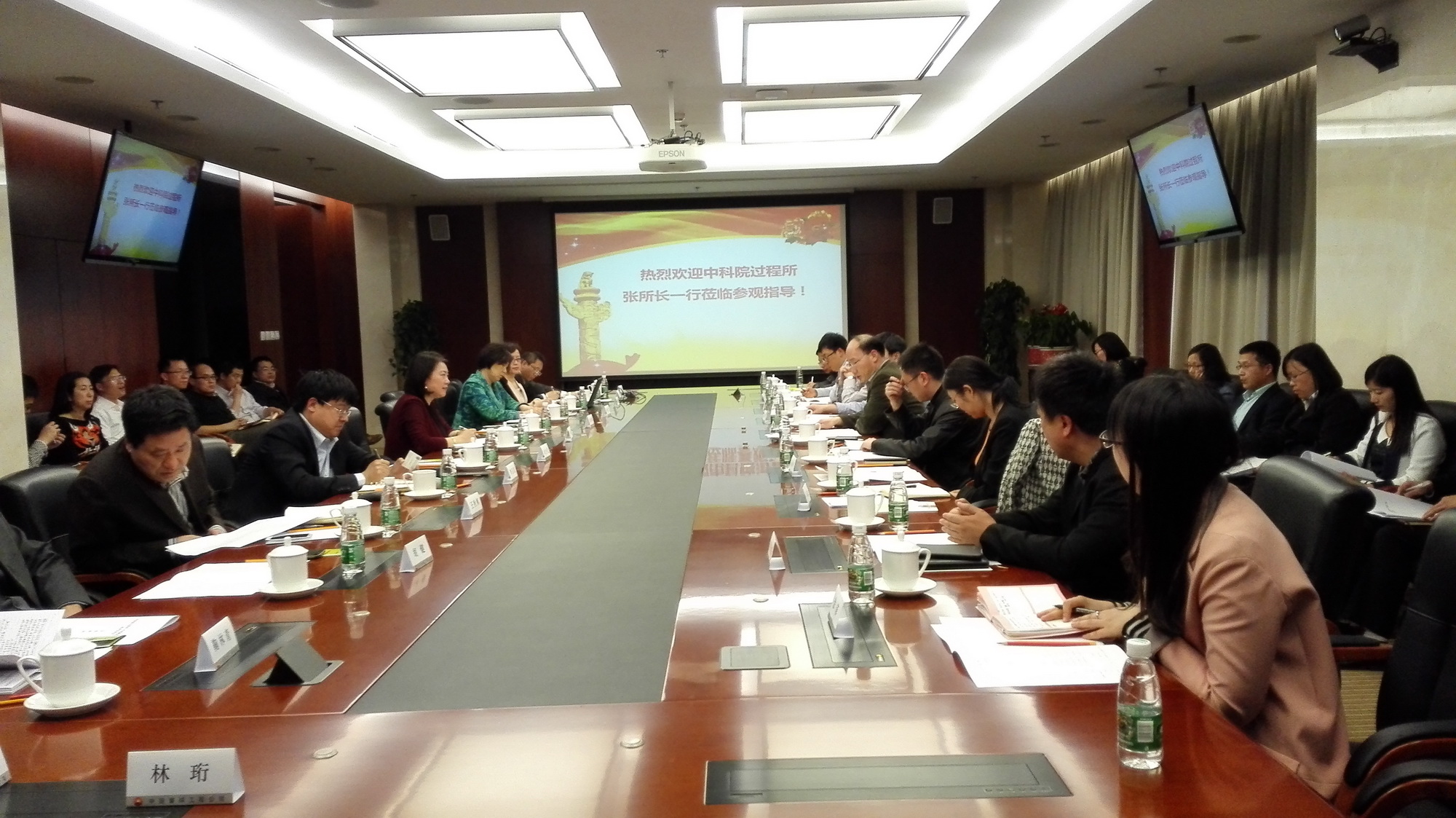 会议期间,过程工程所代表参观了寰球公司科技成果展厅,对寰球的发展历史、人员机构、企业文化等有了进一步深入理解。寰球公司专利与技术开发部副主任顾朝霞对寰球的咨询能力、设计能力以及成功案例作了详细介绍。过程工程所成卫国、闫瑞一、万印华分别就“乙二醇清洁生产成套技术”、“MMA清洁新工艺”、“过程强化与膜污染控制技术”作了总体汇报,双方就技术细节、资源成本等问题进行了详细探讨。