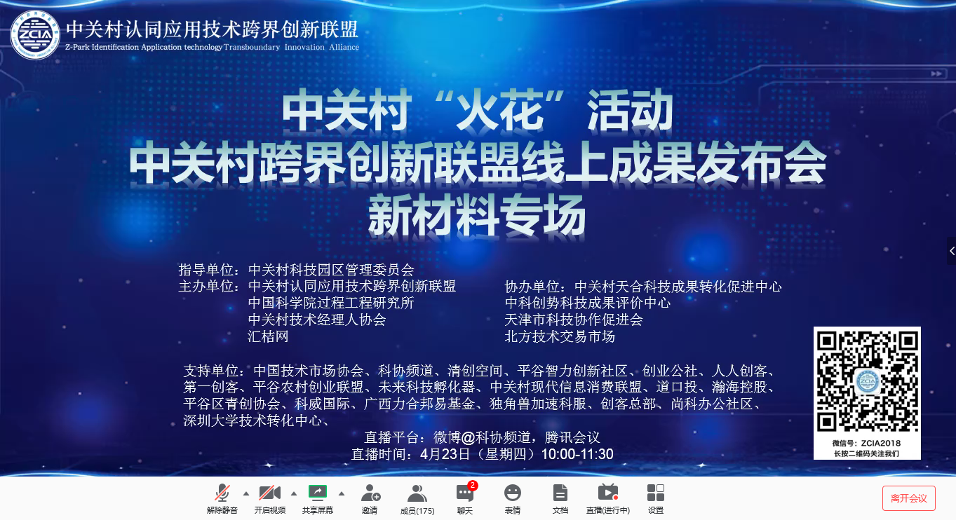 4月23日,过程工程所联合多方举办中关村“火花”活动,通过线上成果发布和在线解答的方式推介了新材料领域的多个项目。来自行业协会、创新联盟、技术转移服务机构、投资机构以及企业的170余位代表参加了此次线上项目对接活动。活动在新浪微博进行了现场直播,6万人次在线观看。过程工程所在院内率先举办“火花”活动,共建平台,整合资源,为我院其他单位开展相关工作提供了借鉴。