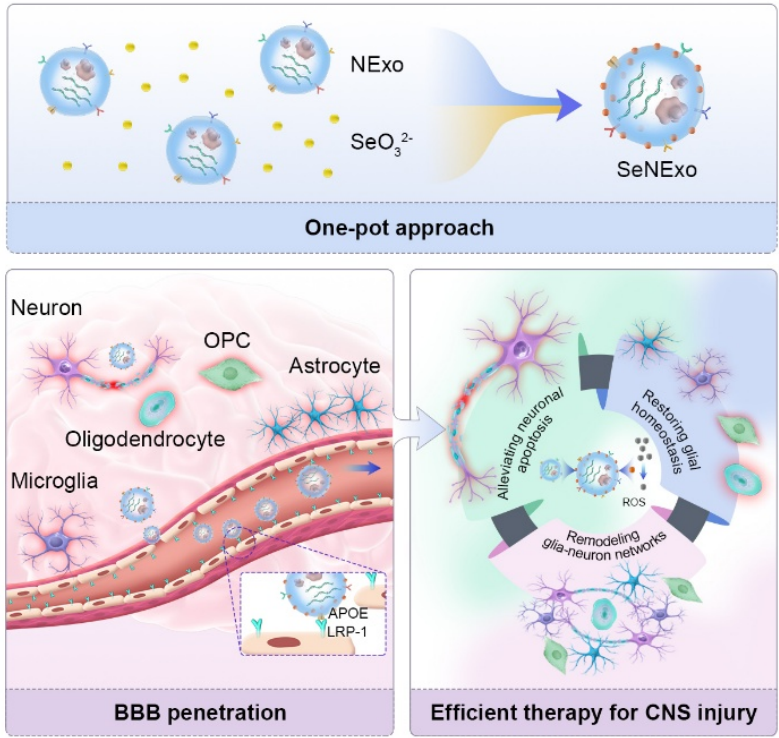 创伤性中枢神经损伤(traumatic central nervous system injury)属于危重急症,在临床上具有高死亡率、高致残率的特点,亟需针对其复杂病理机制发展创新治疗制剂。近日,过程工程所生物药制备与递送全国重点实验室与深圳市第二人民医院合作,设计并创建了硒化神经干细胞外泌体(SeNExo),能够显著缓解神经元凋亡、恢复胶质稳态和重塑胶质-神经网络,在小鼠脑损伤和脊髓损伤模型中获得了出色疗效。相关工作于8月28日发表在Cell Reports Medicine (DOI: 10.1016/j.xcrm.2025.102319)。