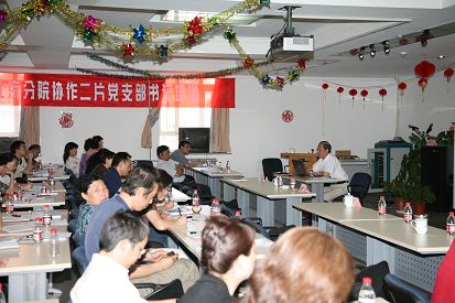 京区党委常务副书记项国英随后从党支部书记的素质能力要求、党支部工作的主要内容及工作方法三个方面对与会人员进行了培训。报告内容不仅涵盖理论基础知识,更有多年工作的经验之谈。他强调,党支部工作要围绕中心、服务大局,坚持党支部能力建设与党的先进性建设相结合,党的建设与创新文化建设相结合,注重发挥党支部的战斗堡垒作用、支部委员的示范带头作用、共产党员的先锋模范作用,着力抓好两个主题活动(“我为创新做贡献”主题实践活动和“永葆先进性”主题教育活动)、“三会一课”(支部大会、支委会、民主生活会和党课)制度、组织发展工作,并将研究生教育列入重要议事日程。他指出,做好研究所党支部工作,要以人为本,学会统筹兼顾(突出重点),重视调查研究(三件宝:学习、调研加思考),善用两种力量(真理的力量,人格的力量),注意软硬结合(刚柔相济)。他认为,做人的最高境界是“仁”,要有宽容爱人之心,谦虚大度,善于同自己持不同意见者共事;做事的最高境界就是“权”,要会权衡利弊,正确处理大我与小我、大家与小家的关系。