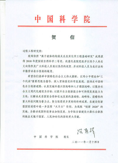 2011年1月14日上午国家科学技术奖励大会在人民大会堂隆重举行。党和国家领导人胡锦涛、温家宝、李长春、习近平、李克强等为获得2010年度国家科技奖代表颁奖。过程工程所“离子液体的构效关系及其化学工程基础研究”项目(获奖人:张锁江、王键吉、张香平、吕兴梅、董坤)荣获国家自然科学二等奖。张锁江研究员作为项目代表出席大会并接受国家领导人颁奖。