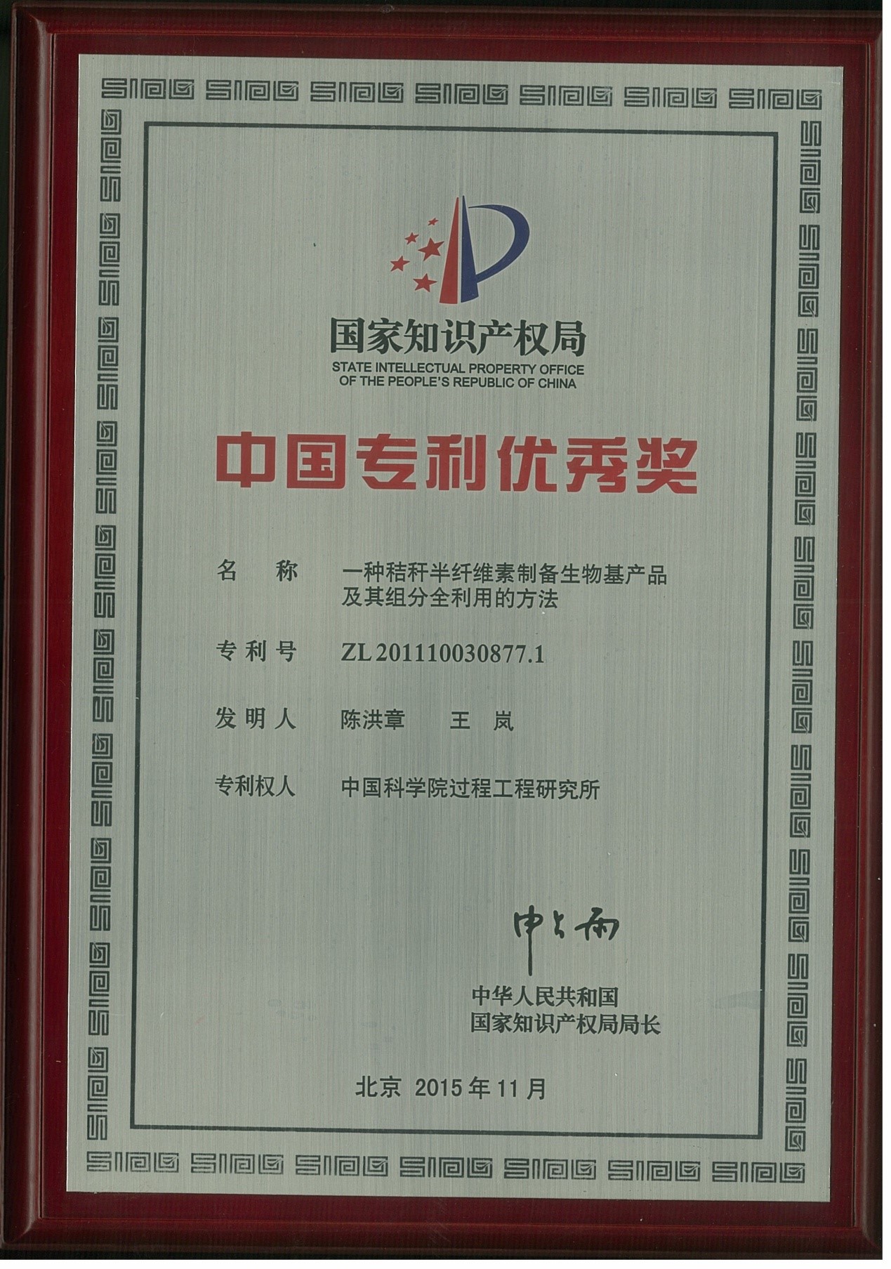 由过程工程所陈洪章研究员和王岚研究员发明的“一种秸秆半纤维素制备生物基产品及其组分全利用的方法”专利获得由中国国家知识产权局和世界知识产权组织共同主办的第十七届中国专利优秀奖。