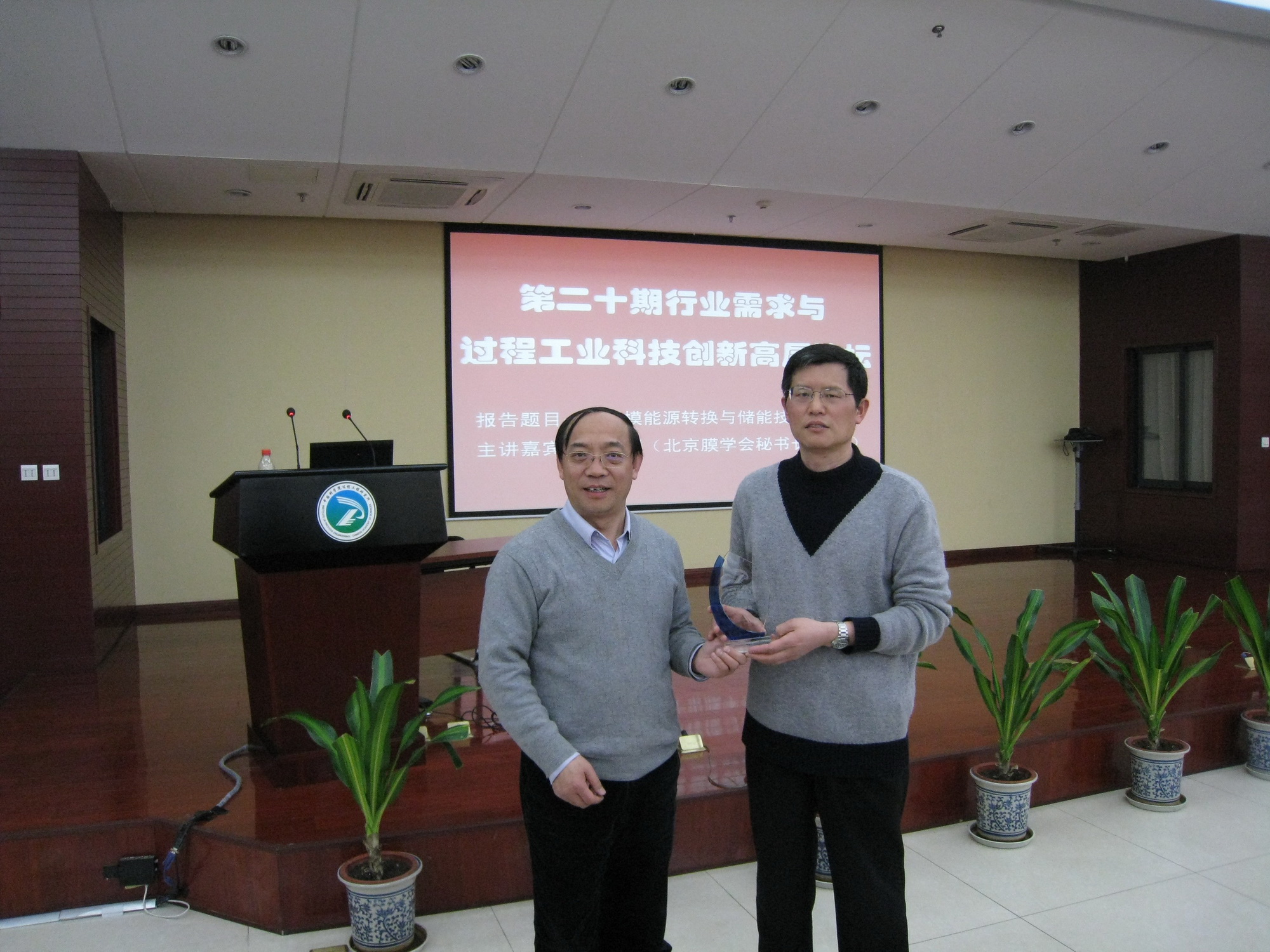 报告结束后,王保国就各类电池等储能元件经济性适用范围、技术创新方向及发展前景等问题与参会人员进行了深入探讨。论坛最后,齐涛副所长代表过程工程所为王保国颁发了论坛纪念水晶奖杯。