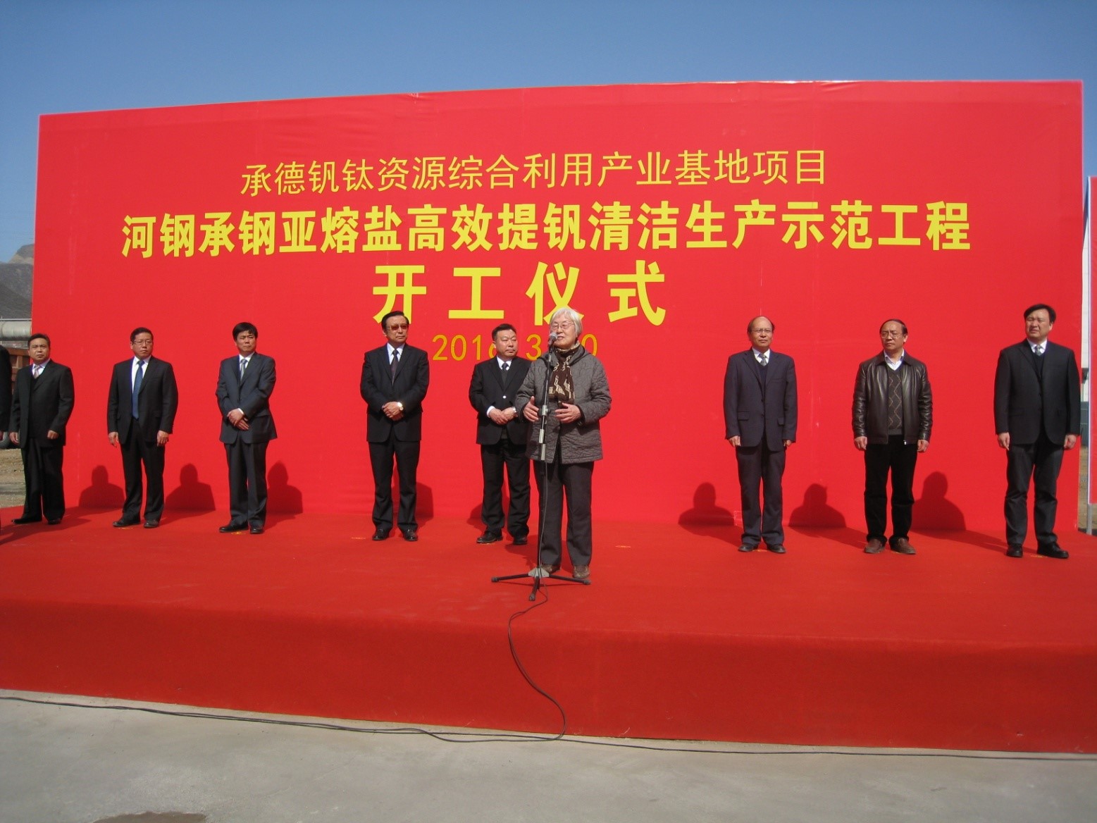 由中国科学院过程工程研究所与河北钢铁集团所属承德钢铁公司合作研发的“5万吨/年钒渣亚熔盐法高效提钒清洁生产示范工程”项目于3月30日在河钢承钢举行了开工仪式。河北钢铁集团、承德钢铁公司及承德市主要领导,过程工程所张懿院士、齐涛副所长及项目主要研发人员出席了开工仪式。