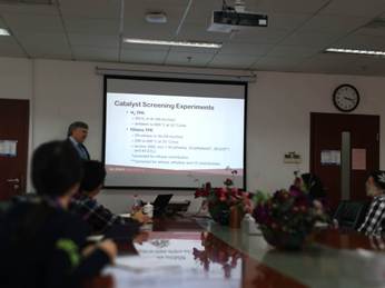 Henry Lamb教授的研究领域主要为多相催化、表面科学、生物化学反应工程。此次沙龙的报告题目为“Oxidative Dehydrogenation of Ethane using MoO3/Fe2O3 catalysts in a Cyclic Redox Mode”。报告中Lamb教授以乙烷氧化脱氢制乙烯的技术为切入点,将催化剂的表面科学技术与北卡罗来纳州立大学李凡星教授提出化学链概念相结合,共同解决乙烷氧化脱氢制乙烯现有的技术难题。Lamb教授还进一步对催化剂的制备、表征、构效关系等进行了深入报告。