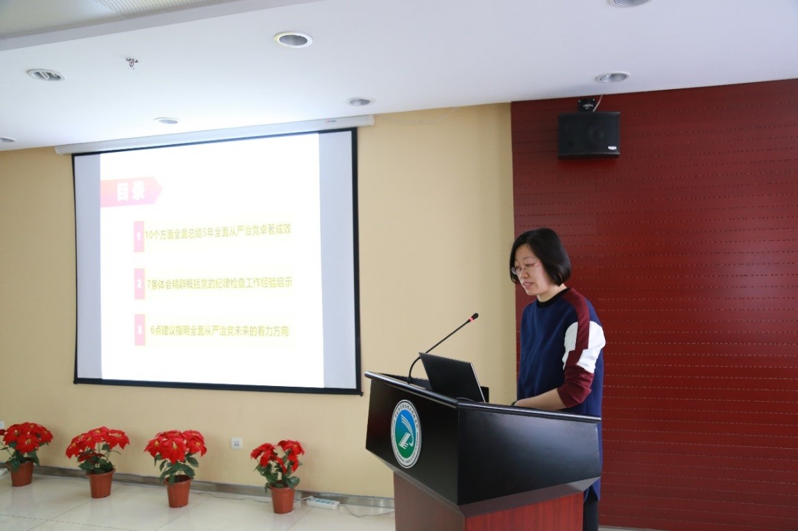 随后,纪监审办公室副主任刘萍为大家作中纪委向十九大报告精神领学,对中纪委五年全面从严治党卓著成效的十个方面,党的纪律检查工作经验启示的七条体会,全面从严治党未来着力方向的六点建议进行了传达。党群办公室主任刘冰就2017年度党建述职评议考核、认真组织学习《习近平谈治国理政》第二卷、进一步纠正“四风”加强作风建设、贯彻落实加强和维护党中央集中统一领导等工作进行了传达部署。