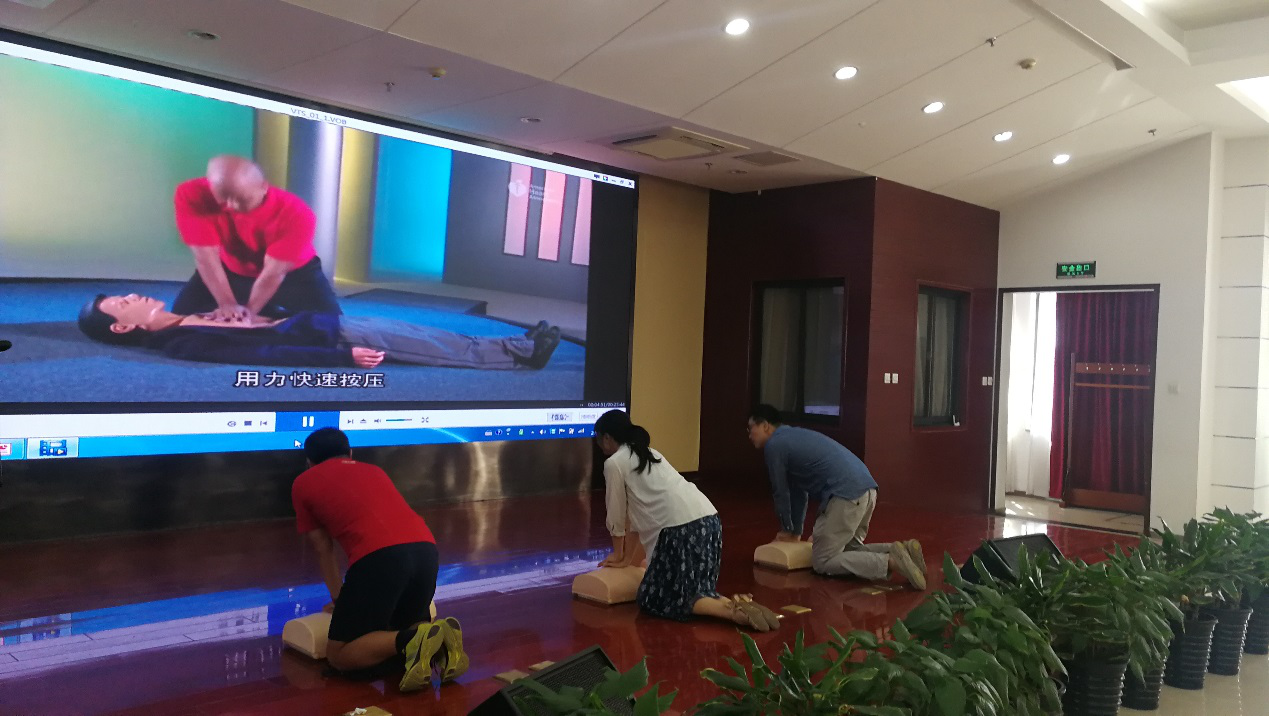 基础理论学习之后,陈亮为大家播放了心肺复苏相关视频,并进行现场演示。为帮助大家扎实掌握专业的心肺复苏方法,现场职工和学生进行了分组实践练习。陈亮强调,在进行心肺复苏操作时,要注意找准按压部位和按压力度,保持正确的按压姿势,必要时配合人工呼吸,且注意按压和通气比为30:2,直至伤员恢复心跳或医护人员到达现场。随后,陈亮结合视频给大家讲解了肢体麻木、癫痫、休克等紧急状况下应当采取的急救措施。